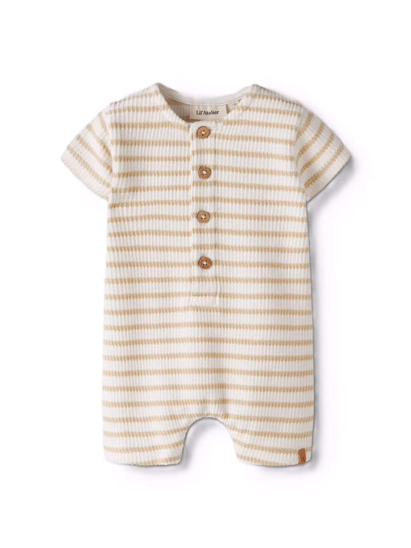 Fin kortärmad suit med korta ben. Body och shorts i ett plagg! Vit botten med beiga ränder. lite ribbat i strukturen.