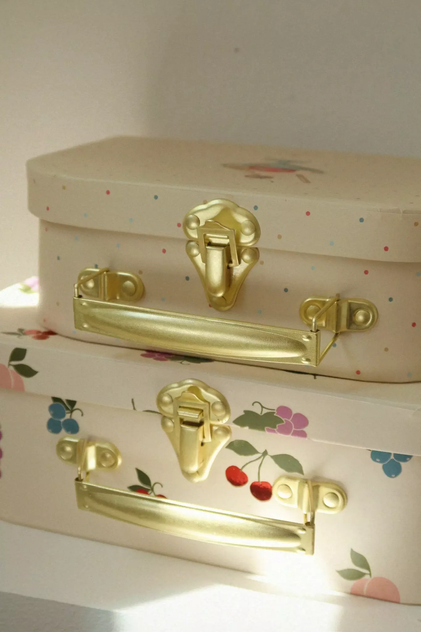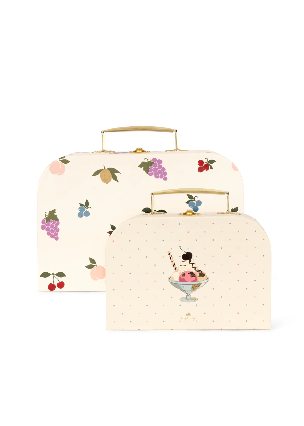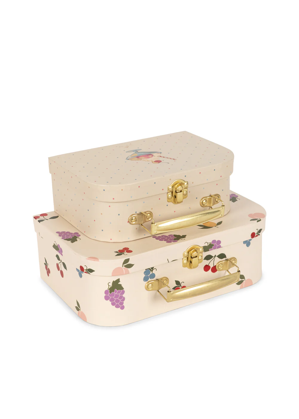 Söta resväskor i 2-pack från Konges Slöjd. Pappväskorna passar perfekt att packa leksaker i eller att ha på hyllan för förvaring.