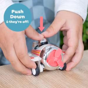 Dessa roliga retro miniracers utan batterier är redo att rulla (inte flyga!) Barn kommer att ha jättekul med dessa smidiga små flygplan, som får framdrift med ett enkelt tryck nedåt, och så är de på väg – rullar längs vilken bana du än hittar! Finns i tre roliga och samlarvänliga designer.