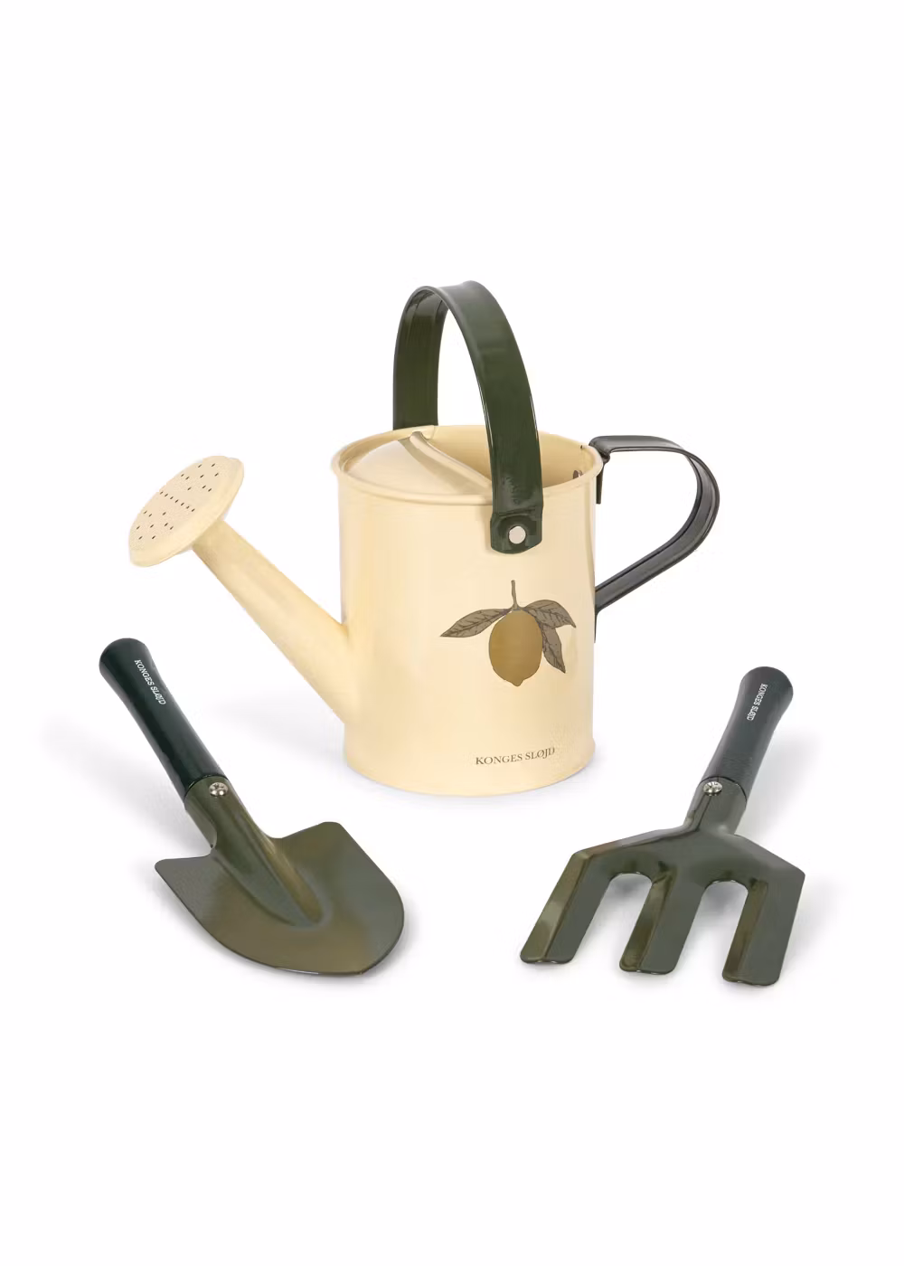Ett komplett trädgårdsset för alla blivande trädgårdsmästare:som innehåller en vattenkanna, en spade och en trädgårdskratta.