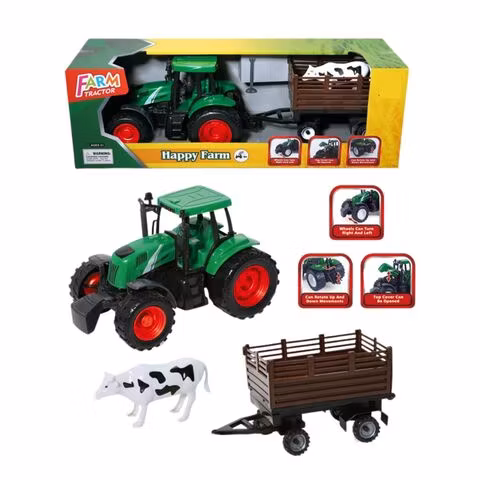 Innehåller en traktor, släp och en kossa.