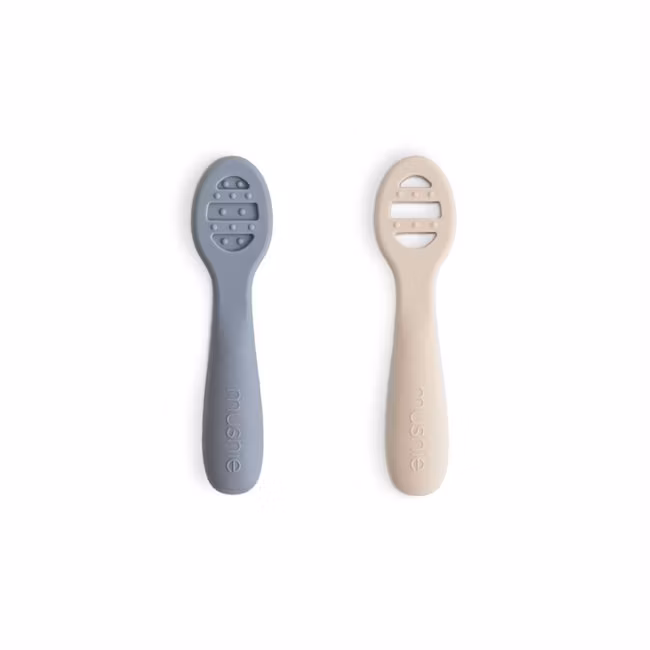 Steg 2-sked: När din lilla utvecklas till mer rejäla texturer, kliver steg 2-skeden med öppna fack in sömlöst. Den är perfekt för att ösa upp tjockare livsmedel som havregryn och potatismos. Mushie First Feeding
